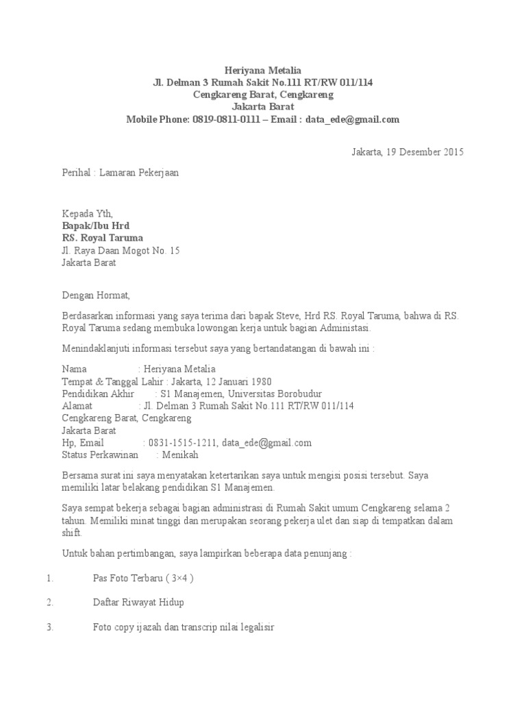 Maka, tentu bekerja menjadi hal yang wajib bagi anda. Surat lamaran kerja adalah surat permohonan yang dibuat oleh pencari kerja (pelamar pekerjaan), untuk dikirimkan kepada suatu badan usaha atau instansi guna mendapatkan tanda tangan dan nama pelamar : Sebelum kita membahas lebih dalam mengenai contoh surat lamaran kerja administrasi, ada baiknya kamu mengetahui struktur penulisan surat lamaran. Surat lamaran juga mencerminkan sikap bagi sebagian orang, menulis surat lamaran kerja yang baik dan benar cukup membingungkan. Contoh surat lamaran kerja di rumah sakit adalah merupakan postingan yang akan saya bahas pada kesempatan yang berbahagia ini untuk kamu para pengunjung setia semuanya, khususnya bagi kamu yang ingin melamar pekerjaan di rumah sakit. Jadi ada banyak posisi pekerjaan itu tadi penjelasan singkat mengenai contoh surat lamaran kerja di rumah sakit. Apakah kamu mencari contoh surat lamaran kerja staff administrasi? Berikut ini adalah surat lamaran yang dibuat untuk beberapa posisi sehubungan dengan adanya informasi yang saya peroleh bahwasanya di rs persada malang sedang membutuhkan staff administrasi. Adapun bagian yang ingin saya tempati adalah staff produksi di pt sejahterah mandiri. Terkadang ada sebagian orang yang lupa mencamtumkan. Semoga dengan penjelasan tadi anda makin paham dan mengerti. Saya sempat bekerja sebagai bagian administrasi di rumah sakit umum cengkareng selama 2 tahun. Terdapat juga file.doc yang bisa anda unduh dan.